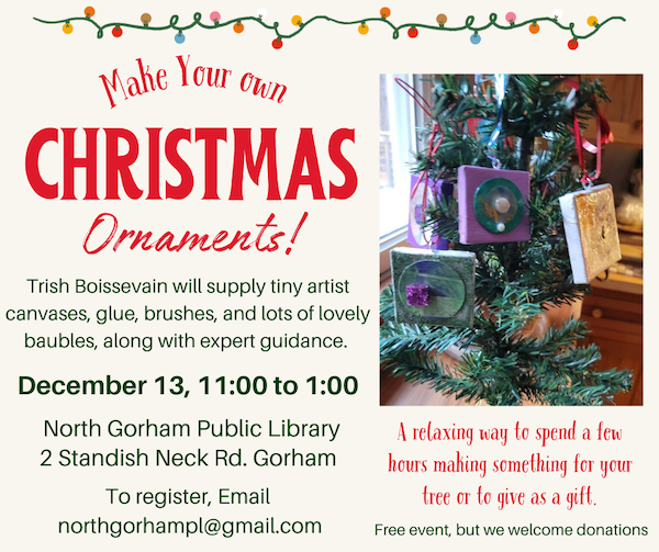 We are going to have some creative fun in the library on Saturday, December 13 from 11:00 a.m. to 1:00 p.m. We’ll be making Christmas ornaments out of miniature artist canvases. We’ll have baubles available for decorating, along with guidance from “crafter extraordinaire” Trish Boissevain.