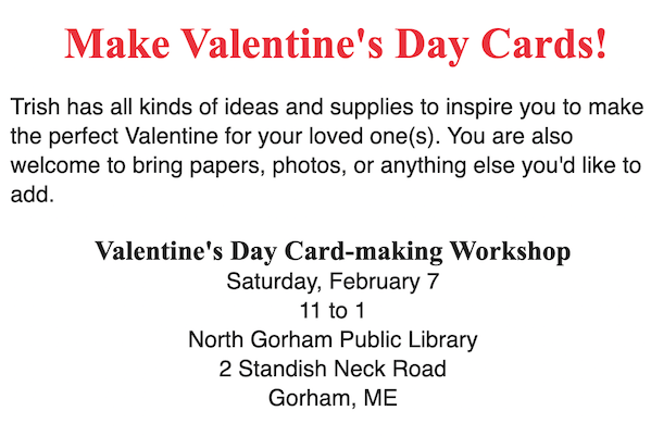 Join us Saturday, February 7, for a Valentine Card-Making Class facilitated by Trish Boissevain. See the details below, and if you plan to attend, please email us at northgorhampl@gmail.com. The class is free, but donations are welcome.